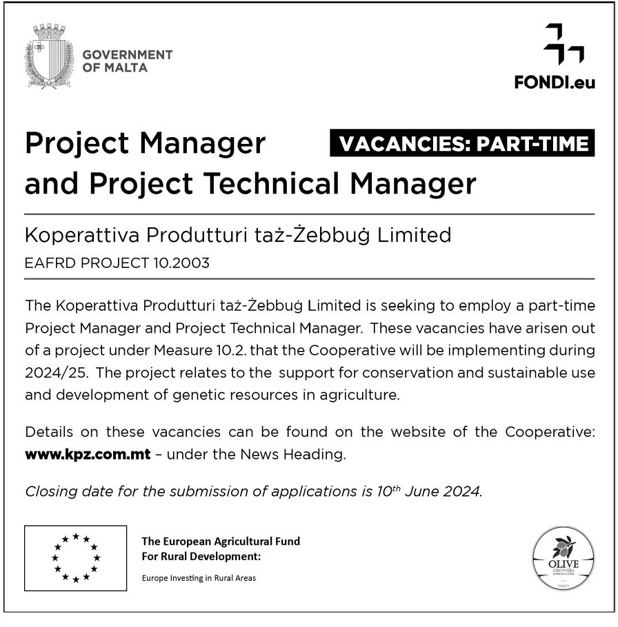 Job Vacancy – Part-Time Project Manager The Koperattiva Produtturi taz-Zebbug Limited is seeking to employ a part-time Project Manager (M/F/X). This vacancy has arisen out of a project under Measure 10.2. that the Cooperative will be implementing during 2024/25. The project relates to the Support for conservation and sustainable use and development of genetic resources in agriculture. Description of the position: The Project Manager will be responsible for initiating, negotiating and managing the project and will work in...
